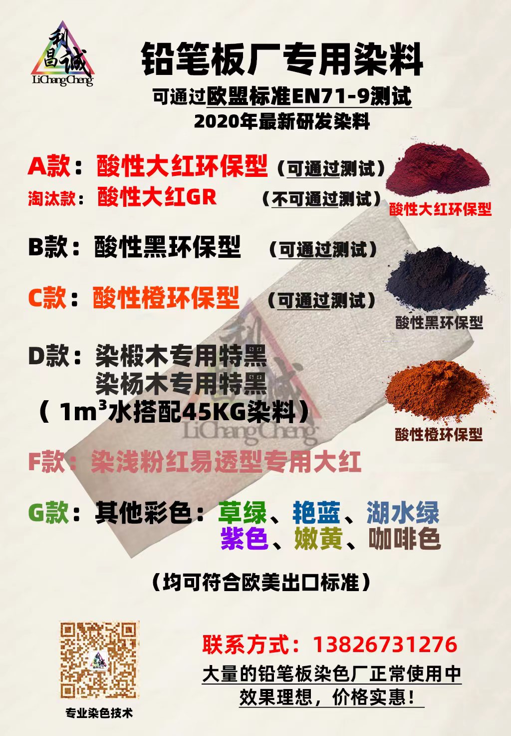 我們提供的木材、竹子、藤條、鋁材、造紙、羽毛、皮革、紡織、編織工藝品等特殊用途系列染料和金屬絡(luò)合溶劑染料,包括直接類(lèi)、分散類(lèi)、堿性類(lèi)、硫化類(lèi)、中性類(lèi)、活性類(lèi)、酸性類(lèi)、弱酸性類(lèi)、酸性媒介類(lèi)、陽(yáng)離子類(lèi)、還原類(lèi)、二色性類(lèi)、木材專(zhuān)用類(lèi)、竹子專(zhuān)用類(lèi)、藤條專(zhuān)用類(lèi)、鋁材專(zhuān)用類(lèi)、石材專(zhuān)用類(lèi)等高牢度染料。